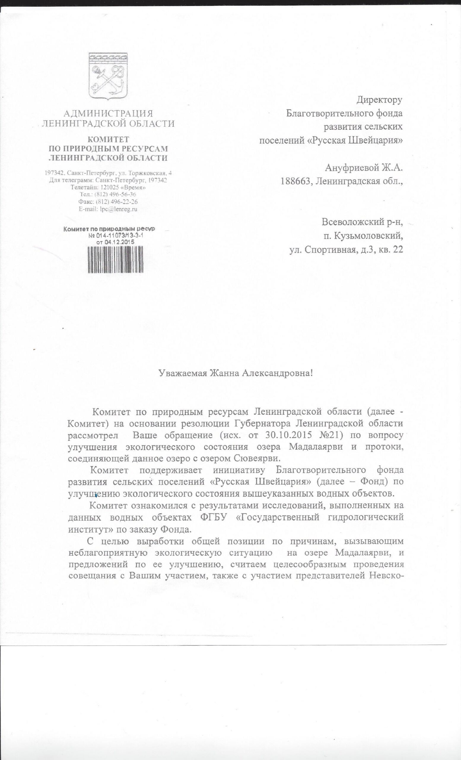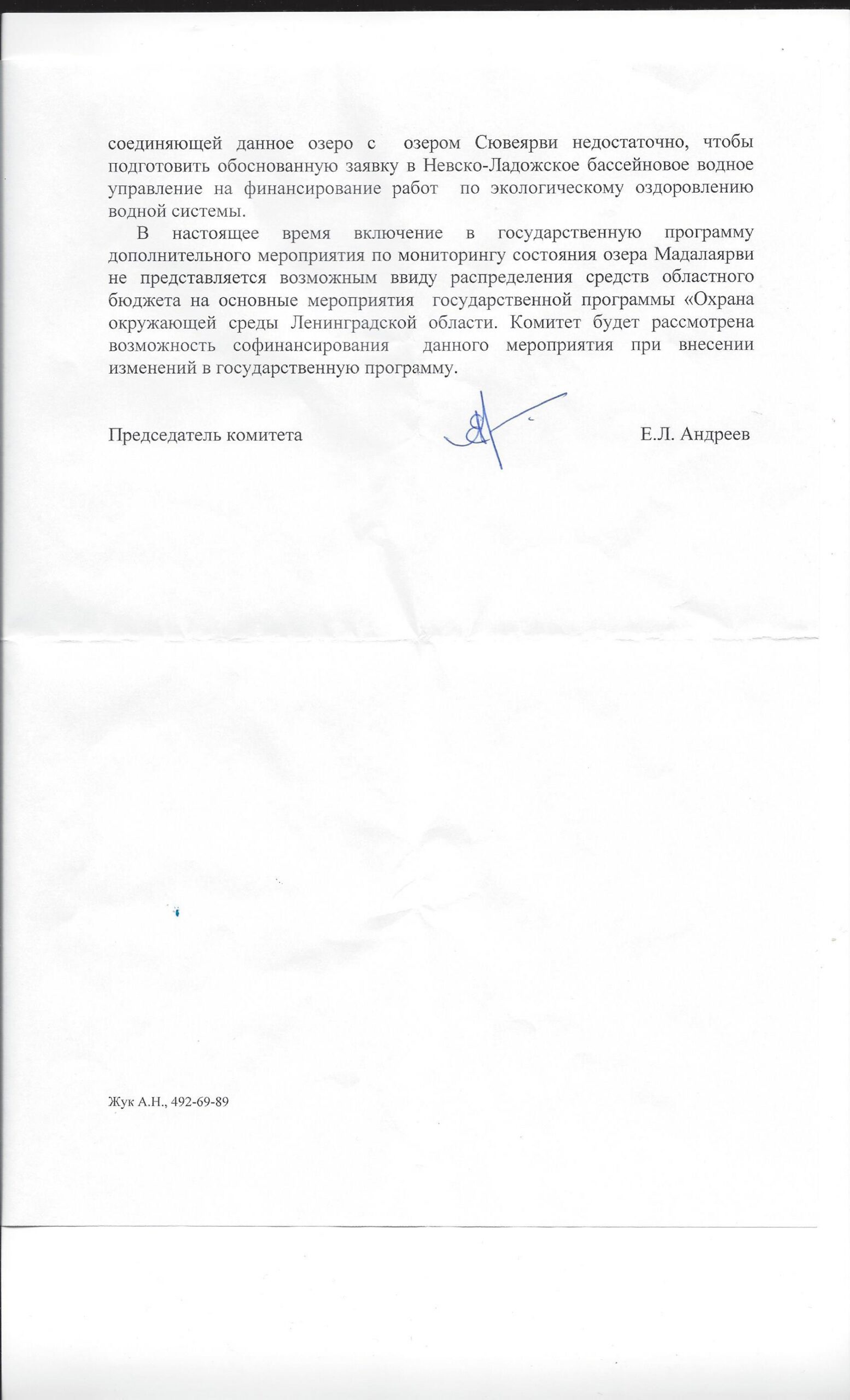 Ответы “Комитета по природным ресурсам Ленинградской области” на обращение по вопросы улучшения экологического состояния озера Мадалаярви и протоки, соединяющей данное озеро с озером Сювеярви.