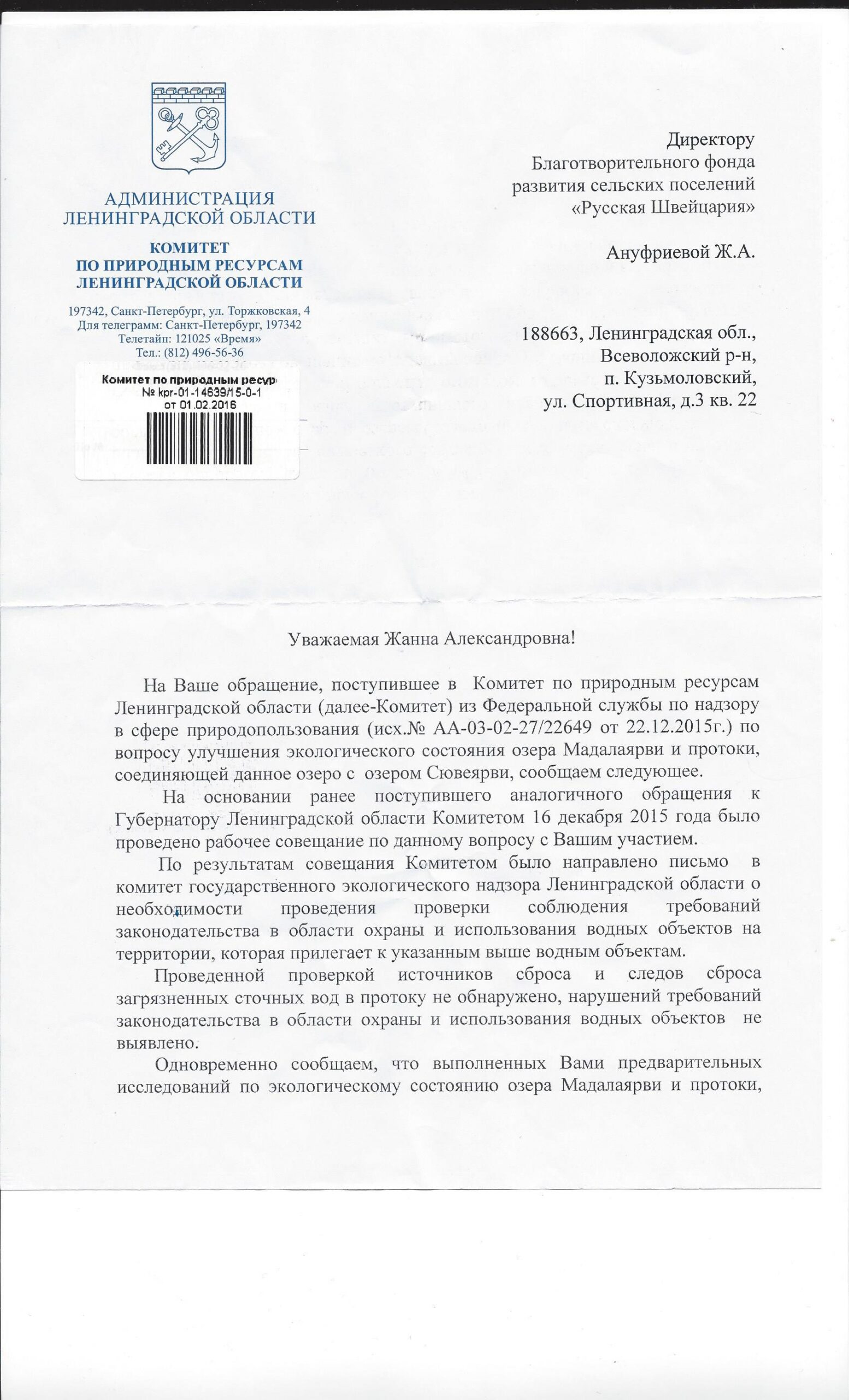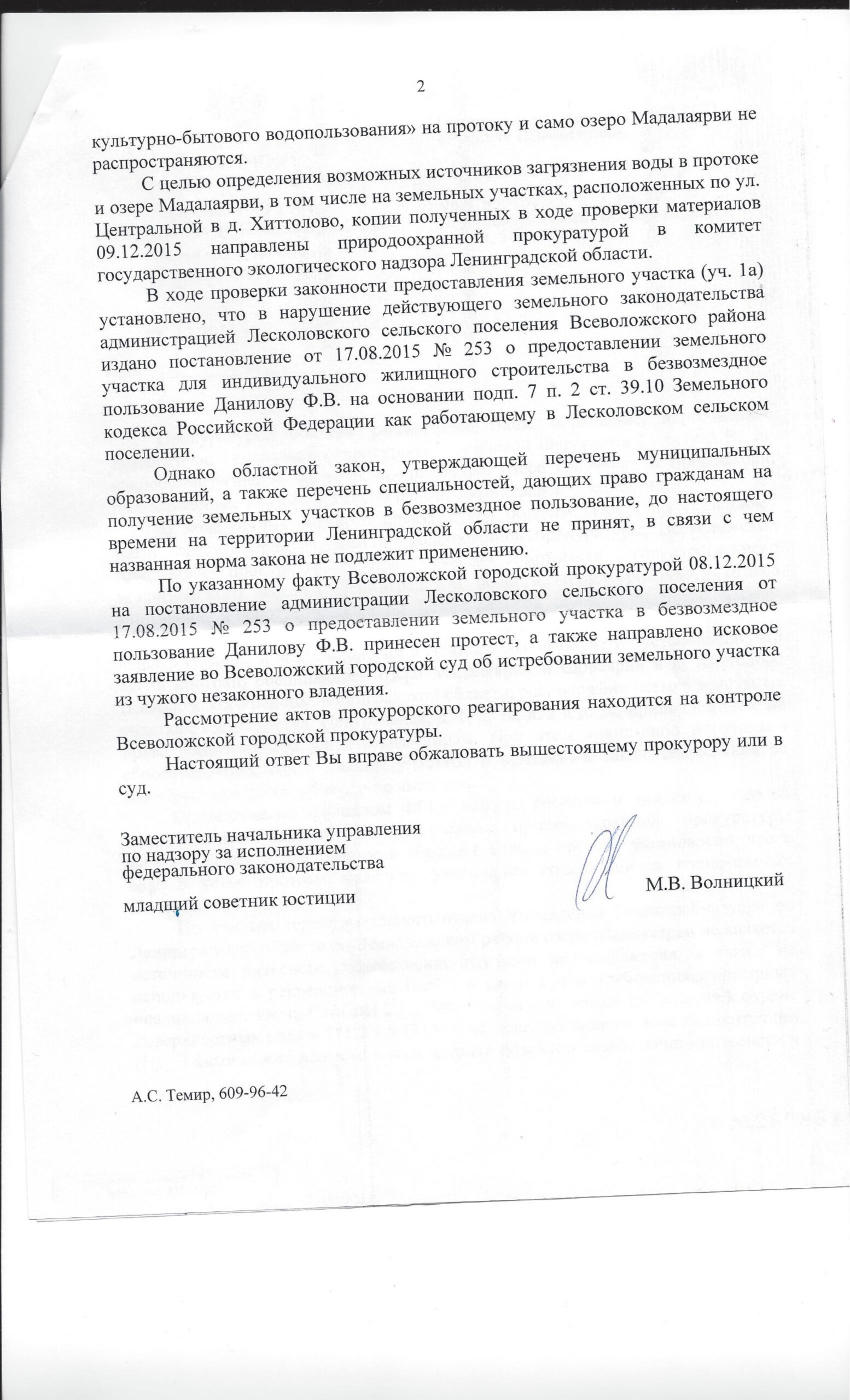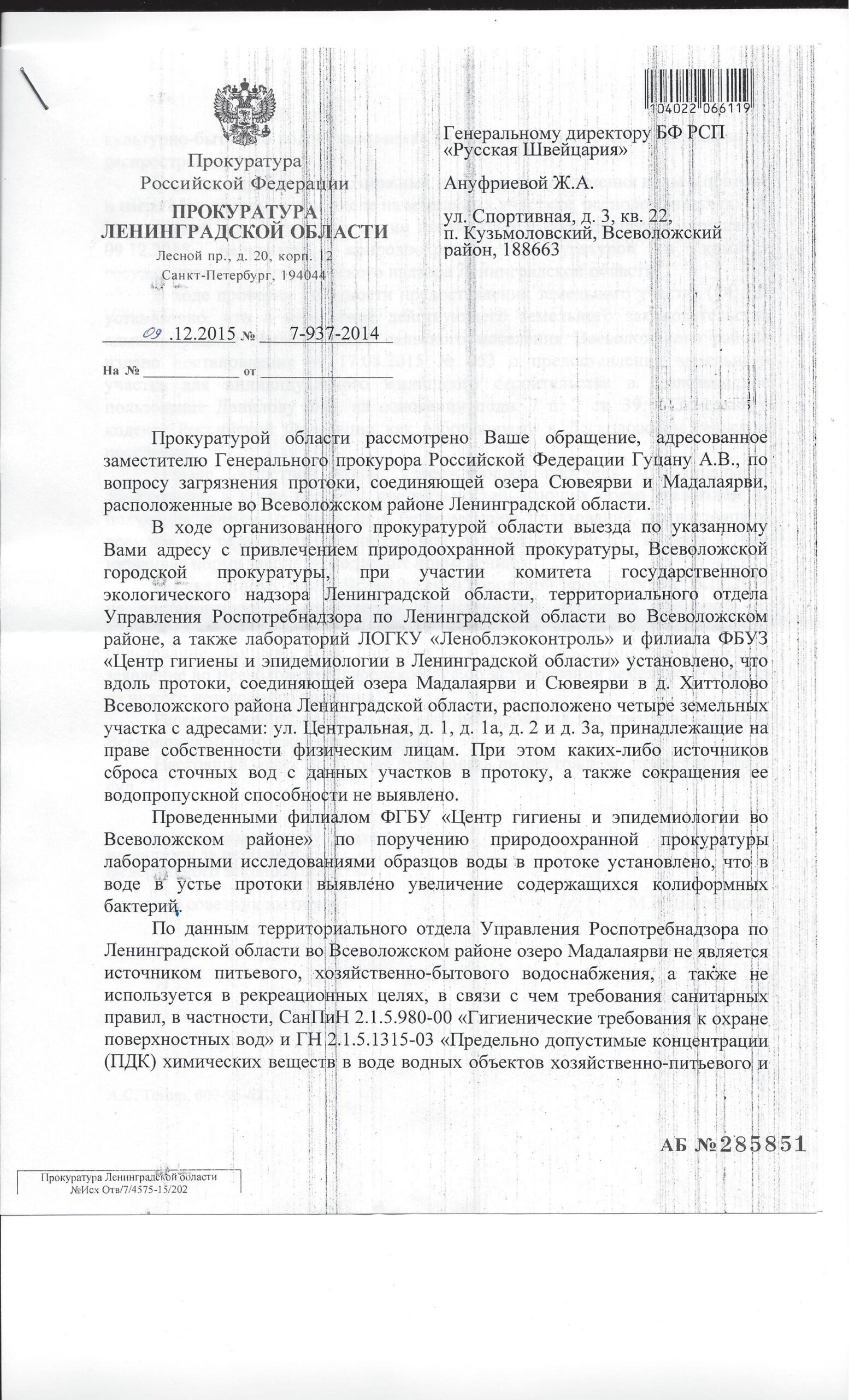 Ответ Прокуратуры Ленинградской области на обращение по вопросу загрязнения протоки, соединяющей озера Мадалаярви и Сювеярви в д.Хиттолово