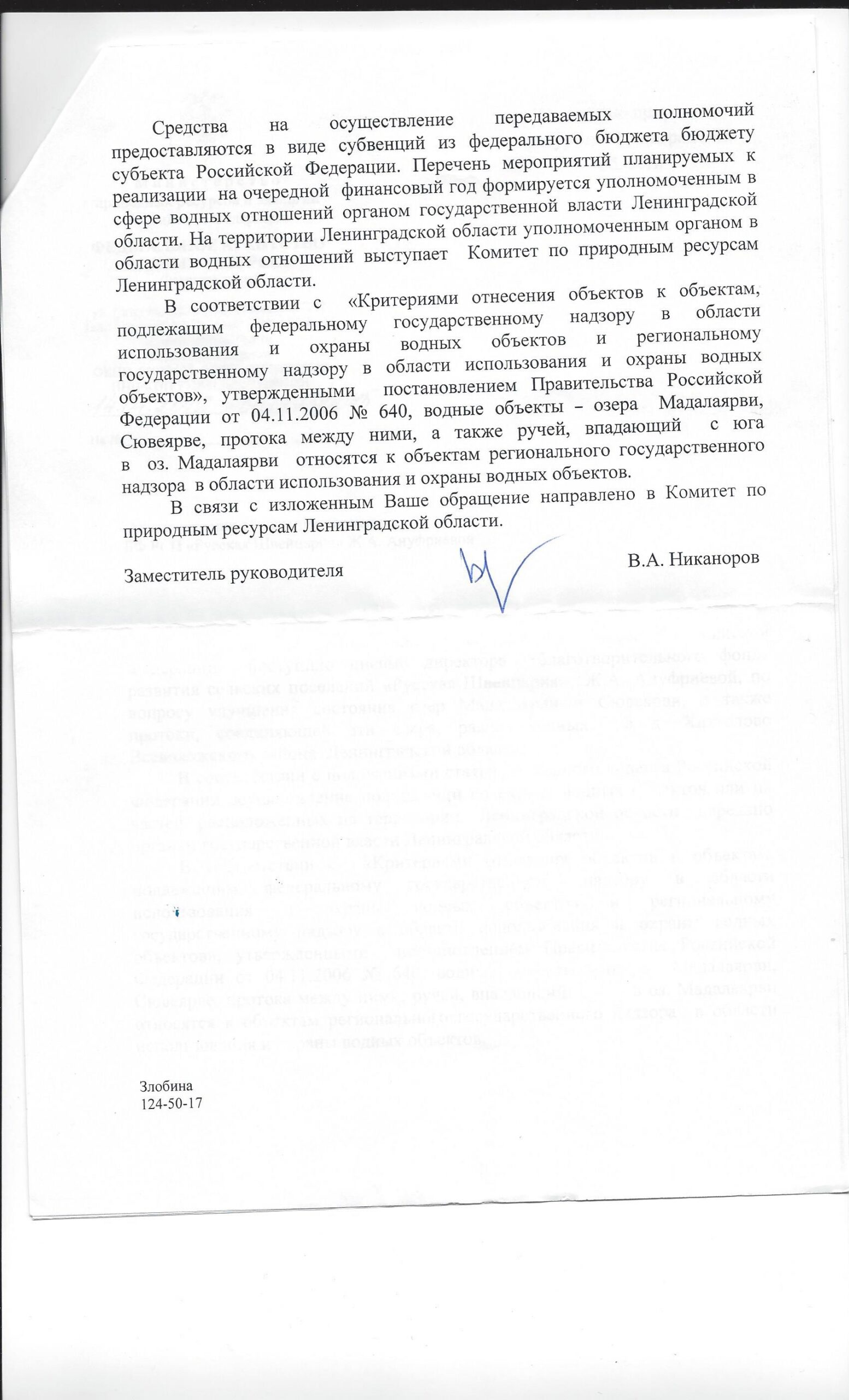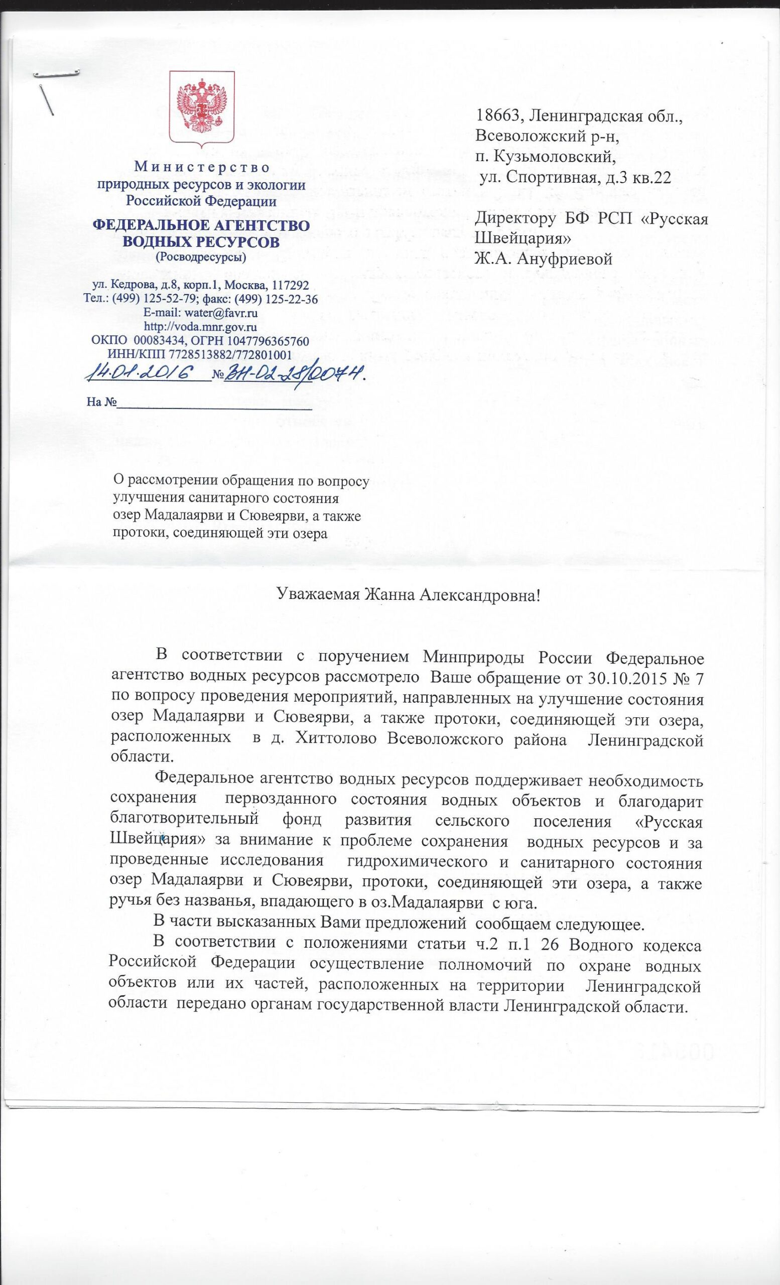 Ответ “Федерального агентства водных ресурсов” на обращение по вопросы улучшения экологического состояния озера Мадалаярви и протоки, соединяющей данное озеро с озером Сювеярви.