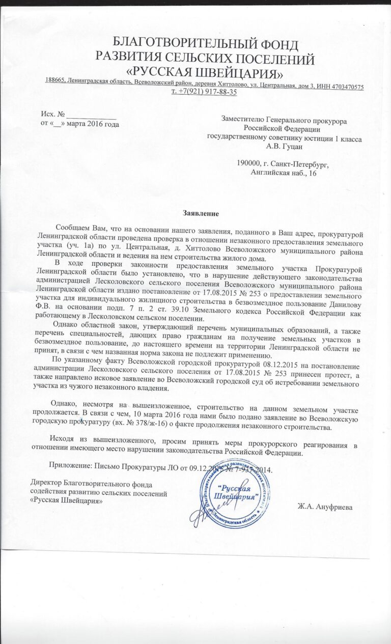 Заявление в Прокуратуру Ленинградской области о факте продолжения незаконного строительства.